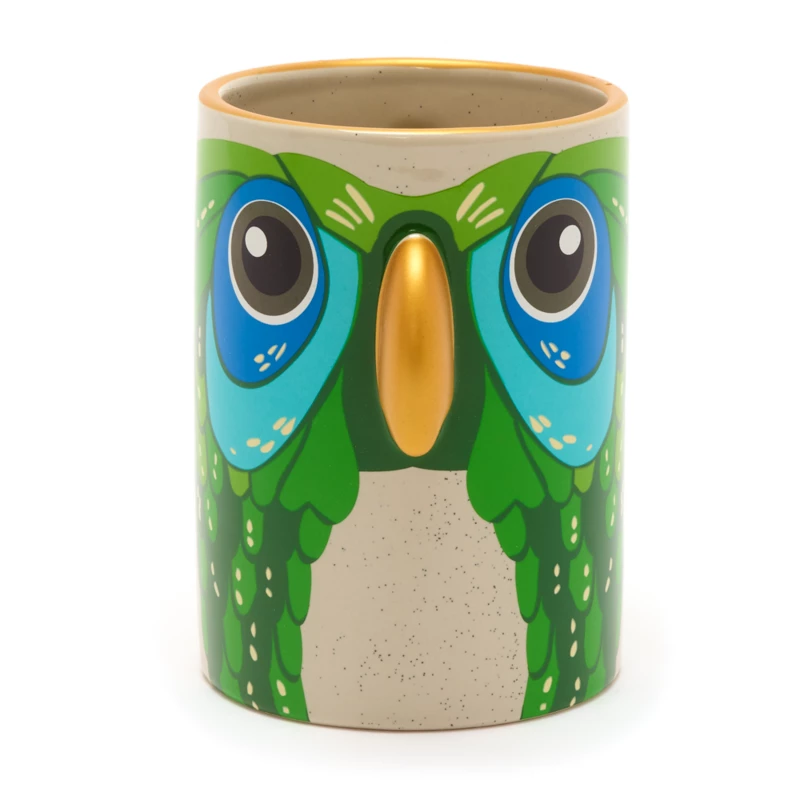 Mary Poppins’ familiar parrot head umbrella handle is repurposed in a most delightful way for this Supercalifragilisticexpialidocious ceramic mug with golden edging, handle, and accents. Time for tea? Spit spot.